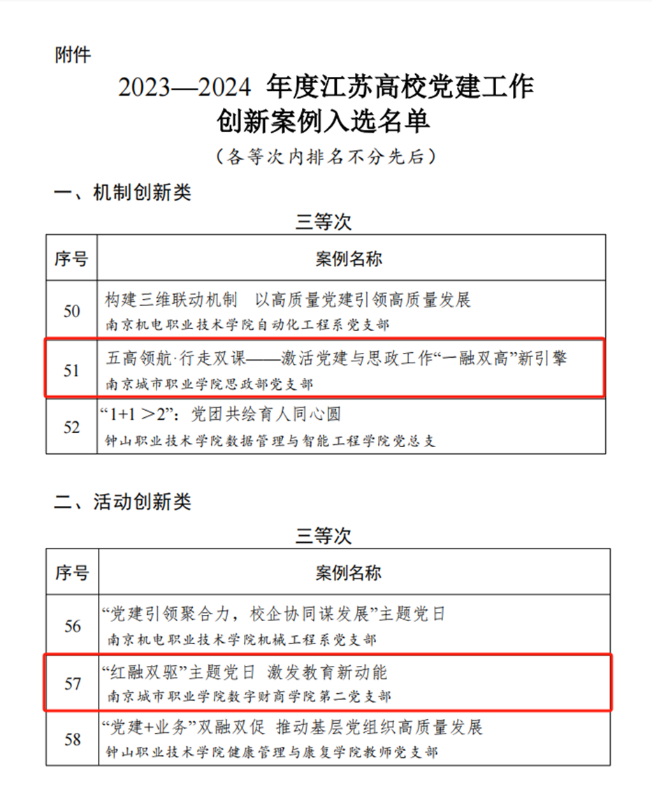近日,省委教育工委公布2023-2024年度江苏高校党建工作创新案例名单,爱游戏(中国)申报的两个案例全部入选。思政部党支部“五高领航·行走双课——激活党建与思政工作‘一融双高’新引擎”案例入选机制创新类第三等次;数字财商学院第二党支部“‘红融双驱’主题党日 激发教育新动能”案例入选活动创新类第三等次。