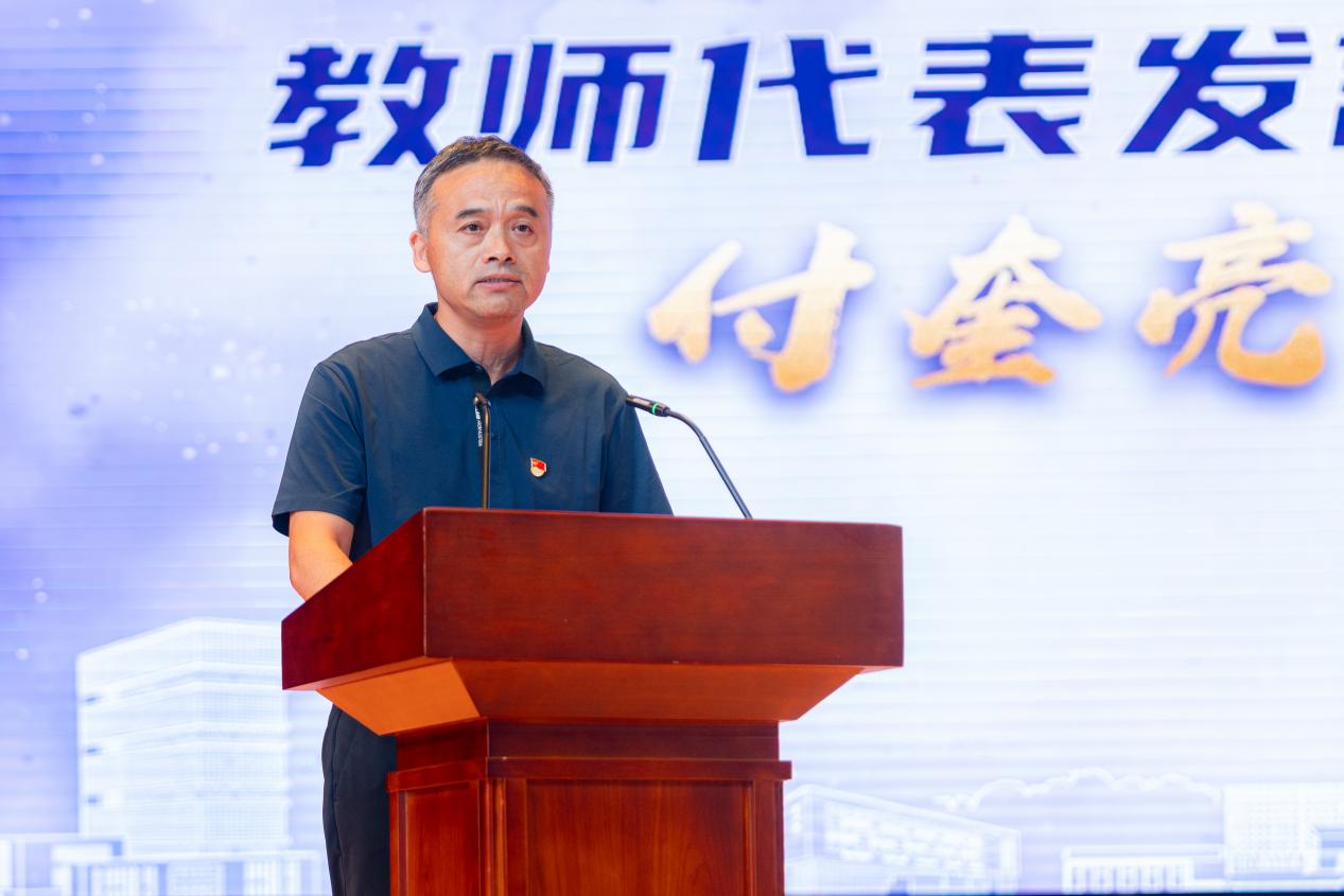 康养工程学院付奎亮老师作为教师代表发言,他围绕“以教育家精神为炬 在职教沃土中耕耘”主题,分享了和团队共同在婴幼儿托育专业初创期坚守一线“阵地”、于“岗课赛证”融合探索中破浪前行的感人故事。现场热烈而又温情的气氛令与会人员深受触动,会场掌声雷动。