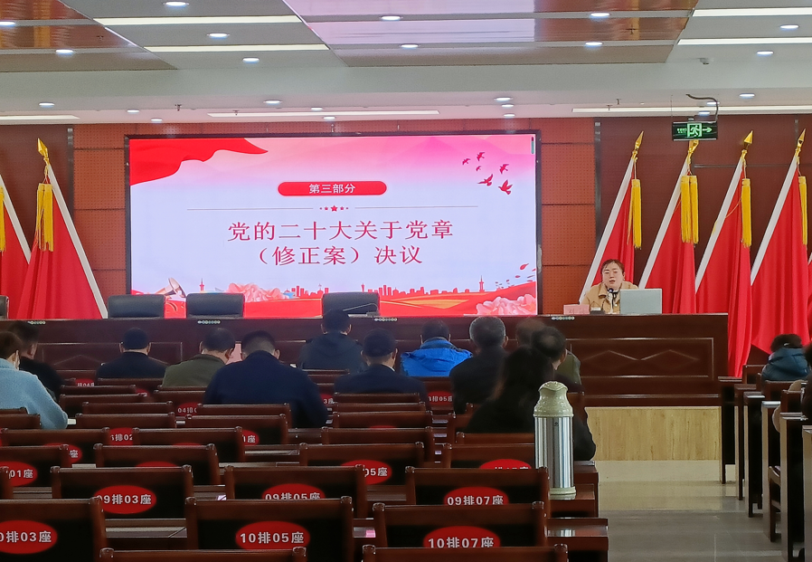 活动中,马克思主义学院刘晨老师以《二十大党章的30个重要修改》为题,“中国共产党章程基本概述”、“党的二十大修改党章的重大意义”、“党的二十大关于党章(修正案)决议”、“二十大党章的30个重要修改”四个方面着手,对党章修订案进行了深入浅出的解读。对全体党员干部深刻领会党章的核心要义,深入学习贯彻党的二十大精神,具有很强的指导意义。