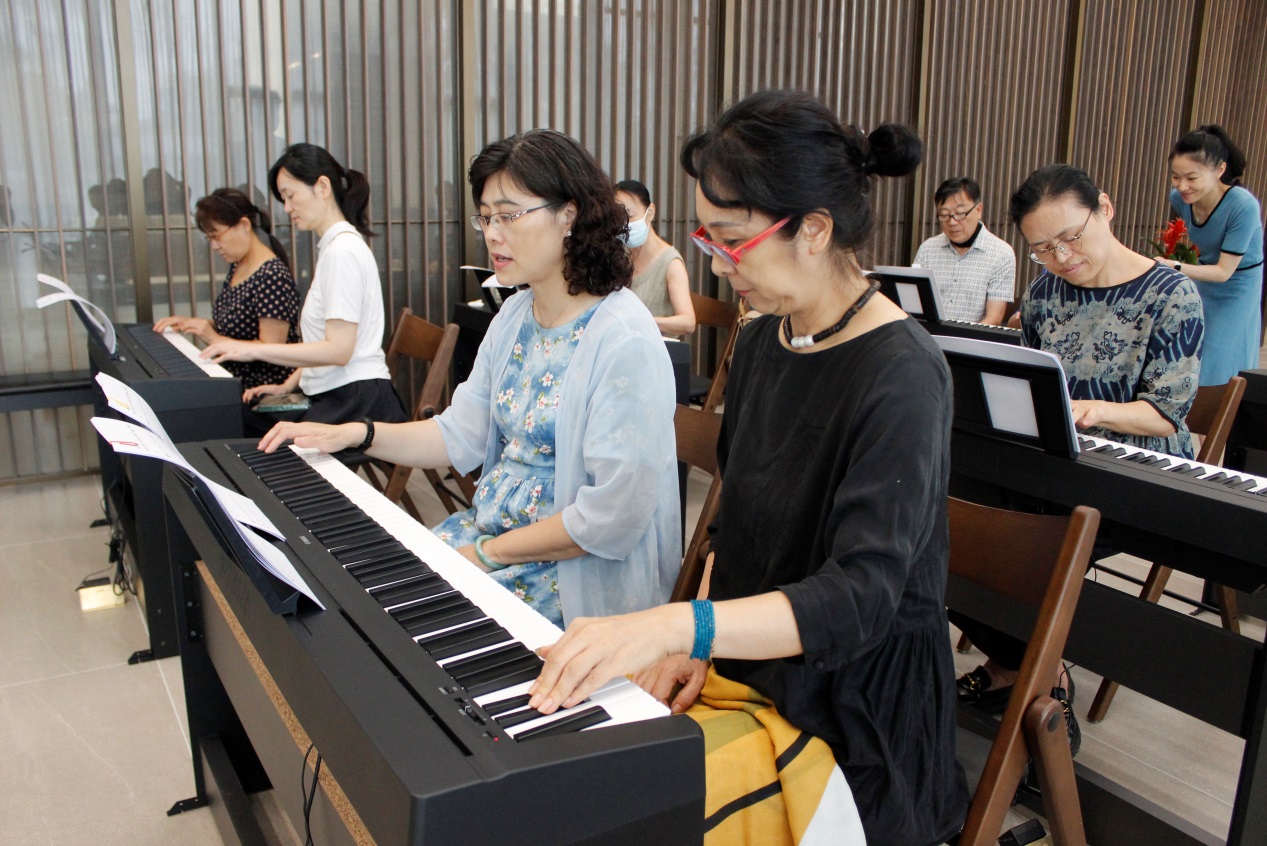 在钢琴课上,刘老师为大家讲解了钢琴基础知识等内容,并介绍了不同的钢琴种类、钢琴在独奏与伴奏中的作用,学员们认真地听取老师的讲解并在指导下进行练习。活跃的课堂氛围中,他们用优雅的姿态和面对新知的热情,演绎了在自我价值提升的过程中,持续学习的韧劲和愉悦乐观的心境。