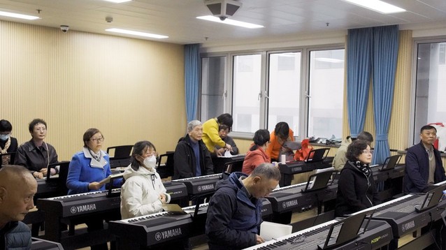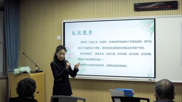 在钢琴课上,刘老师为大家讲解了钢琴基础知识等内容,并介绍了不同的钢琴种类、钢琴在独奏与伴奏中的作用,学员们认真地听取老师的讲解并在指导下进行练习。学员们一边跟着打节拍,一边跟着唱谱,在活跃的课堂氛围中,他们用优雅的姿态和面对新知的热情,演绎了老有所学、老有所乐的自我价值提升。