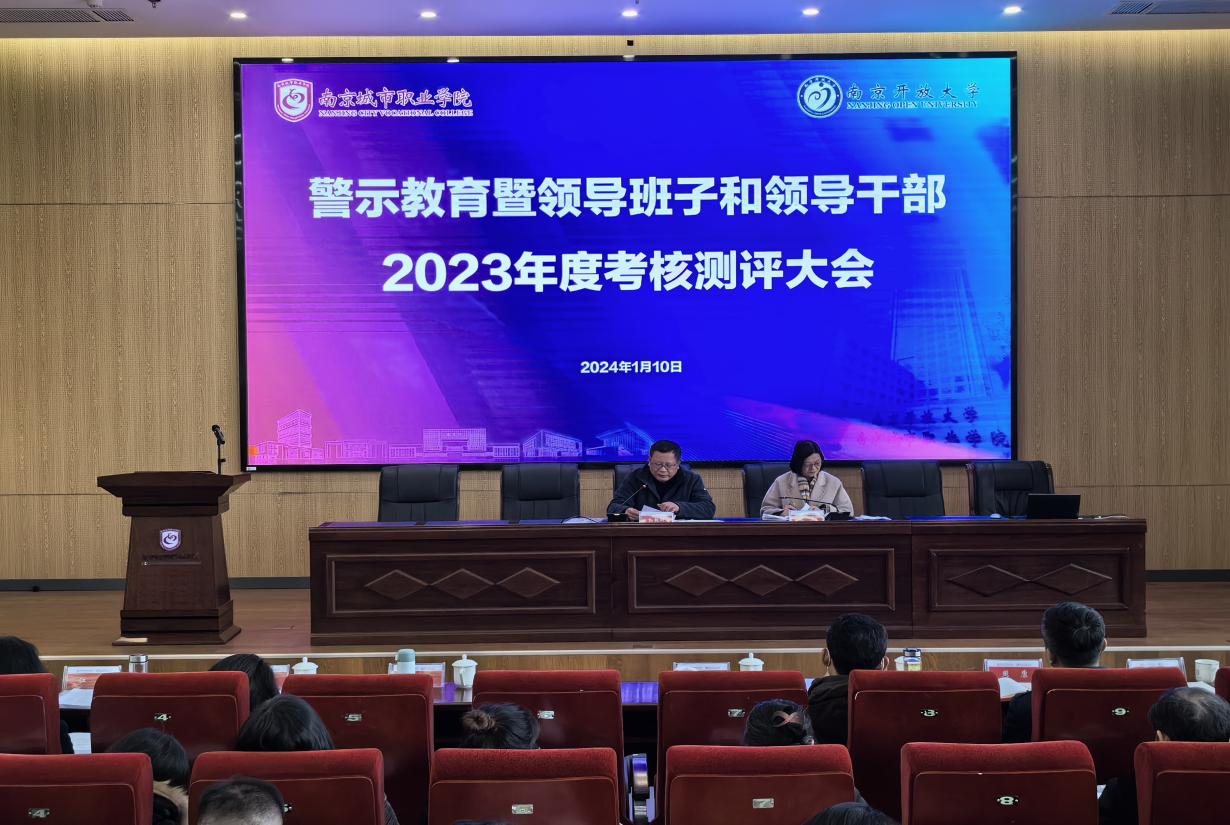 1月10日下午,学校在溧水校区办公楼报告厅召开警示教育暨2023年度领导班子和领导干部考核测评大会。全体校领导、全体中层干部、校纪委委员、区以上“两代表一委员”、高级职称代表、群众代表参加会议。校党委副书记、校长倪杰主持会议。