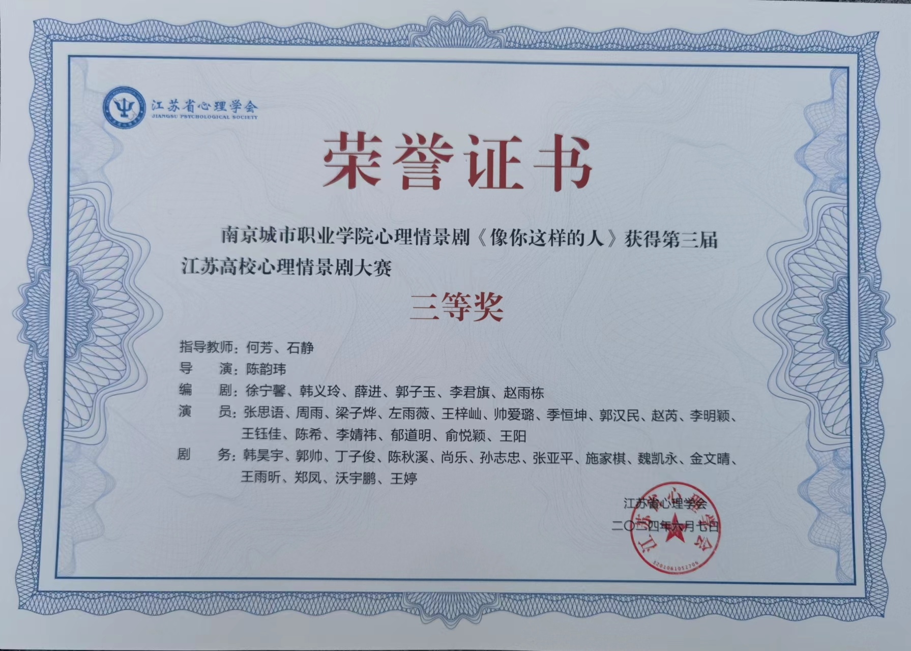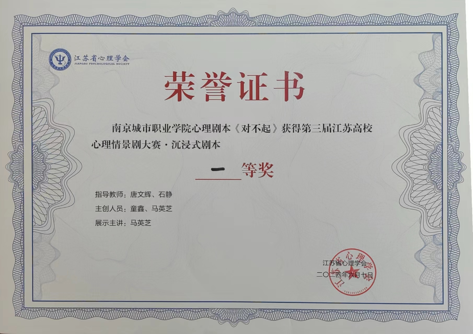 2024年6月7日,由江苏省心理学会主办的第三届江苏高校心理情景剧大赛决赛在南京工业大学举行。以数字文创学院学生为主体创作的爱游戏(中国)作品《对不起》通过独特视角和深刻内涵赢得评委和观众一致好评,在“沉浸式”心理剧本赛项中取得一等奖佳绩,唐文辉、石静获优秀指导教师奖。该作品聚焦宿舍冲突解决,通过贴近大学生实际生活的情节和精巧的剧本构思引发在场观众强烈共鸣。以康养工程学院学生为主体的爱游戏(中国)作品《像你这样的人》通过生动的表演和精彩的剧情,向观众展示了大学生追求自我、实现人生价值的点滴故事以及这一过程中的心理变化,在舞台心理情景剧赛项中获得三等奖,何芳、石静获优秀指导教师奖。