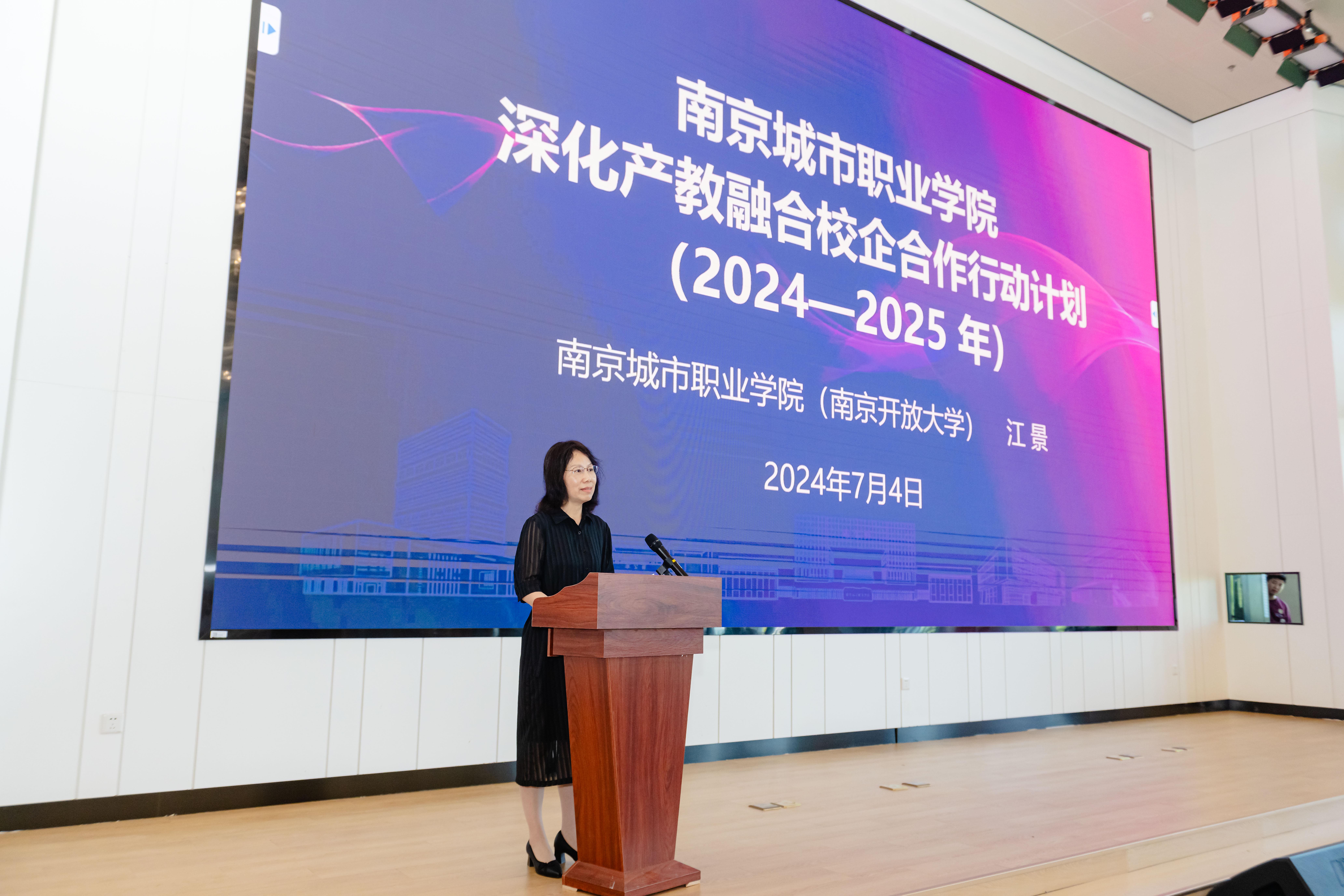 党委委员、副校长江景发布了《南京城市职业学院深化产教融合校企合作行动计划(2024-2025)》。江景介绍,该行动计划旨在推进学校办学育人、与行业企业深度融合,进一步完善校企协同育人长效机制,以期对南京乃至江苏的区域经济社会发展做出更大贡献。她从行动目标、重要任务以及保障措施三个部分详细介绍了行动计划。她表示,学校将进一步积极研制构建产教融合校企合作规划,落地产教融合相关制度,扎实推进各项产教融合重点项目建设工作,努力培养新质生产力所需的高素质技能人才,赋能南京新质生产力发展。