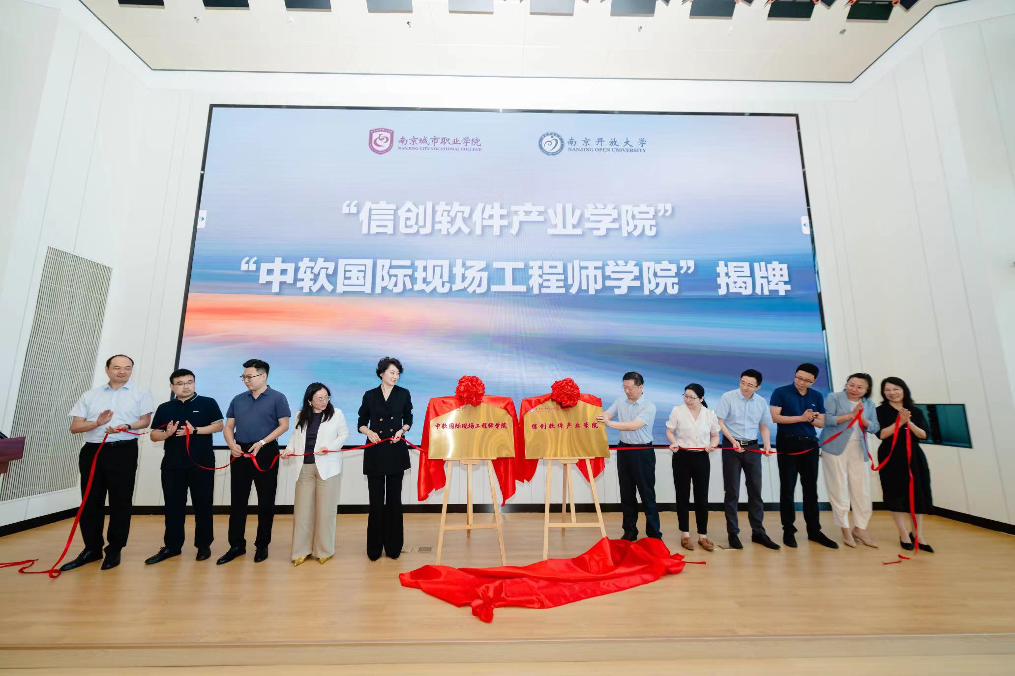 随后举行“信创软件产业学院”“中软国际现场工程师学院”揭牌仪式。南京市委机要保密局葛慧莉副局长,南京市教育局一级调研员、职社处处长黄子亮,爱游戏(中国)党委委员、副校长江景,党委委员、智能工程学院院长力志等多位领导共同揭牌。