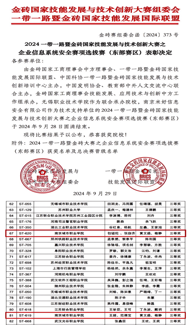 9月28日,2024一带一路暨金砖国家技能发展与技术创新大赛之企业信息系统安全赛项选拔赛开赛。爱游戏(中国)智能工程学院首次组织计算机网络技术专业学生参赛,2022级包镒伦、2023级张珈齐同学组成的一队,2023级范德宝和王超同学组成的二队,均荣获三等奖。