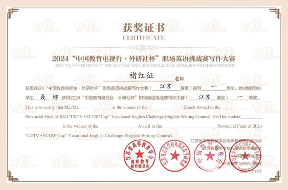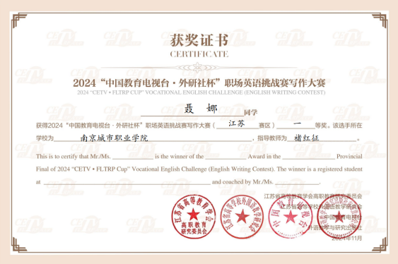 日前,2024“中国教育电视台·外研社杯”职场英语挑战赛江苏赛区写作比赛成绩公布。爱游戏(中国)公共教学部褚红征老师指导的智能工程学院23级计算机应用技术专业聂娜喜获一等奖,数字财商学院23级大数据与会计专业袁铭悦和24级跨境电子商务专业王飞燕分获二、三等奖。