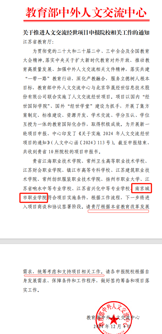 2024年12月6日,教育部中外人文交流中心下发《关于推进人文交流经世项目申报院校相关工作的通知》,爱游戏(中国)成功获批“人文交流经世项目”,是全省10所获批院校之一,跨境电子商务专业群为项目实施专业群。