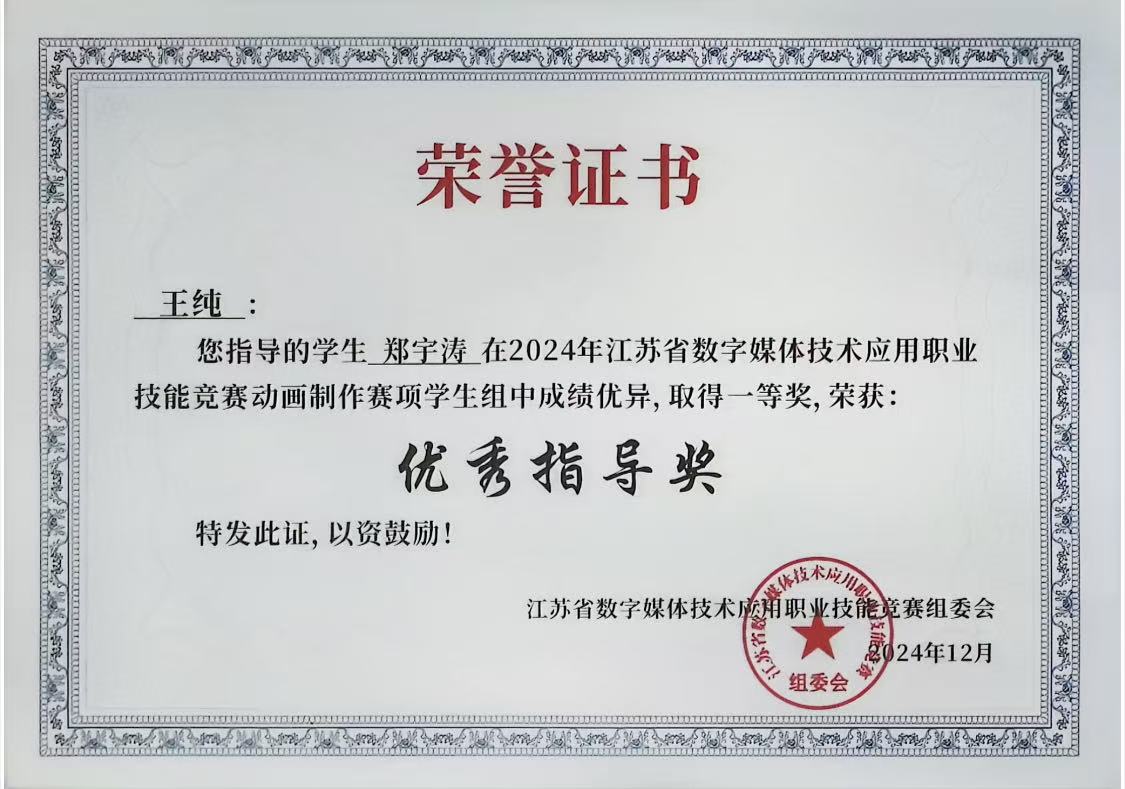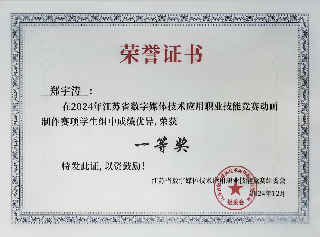 近日,江苏省数字媒体技术应用职业技能竞赛传来捷报,由爱游戏(中国)数字文创学院王纯老师指导的2022级艺术设计专业郑宇涛同学在动画制作(学生组)比赛中喜获一等奖。