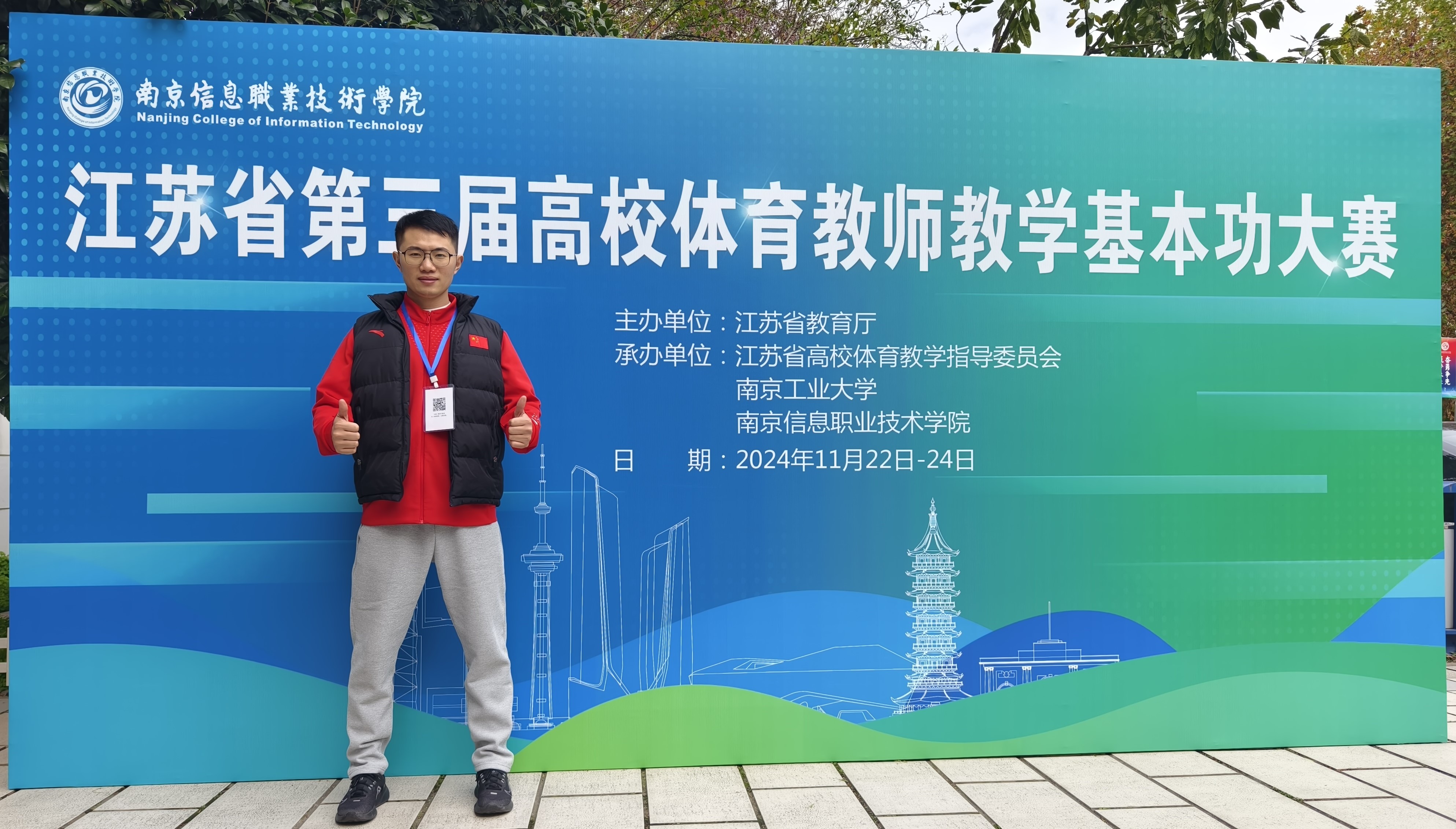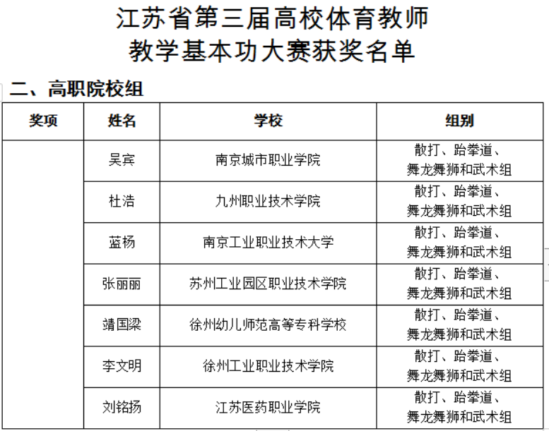 2024年11月21日至11月24日,由省教育厅主办的江苏省第三届高校体育教师基本功大赛在南京举行。爱游戏(中国)吴宾、李明2位教师参加高职组比赛,经激烈角逐,吴宾老师荣获三等奖。徐京朝教授被省教育厅选派担任本次大赛评审专家。
