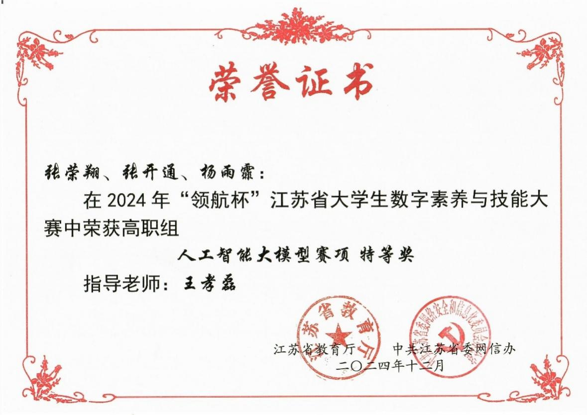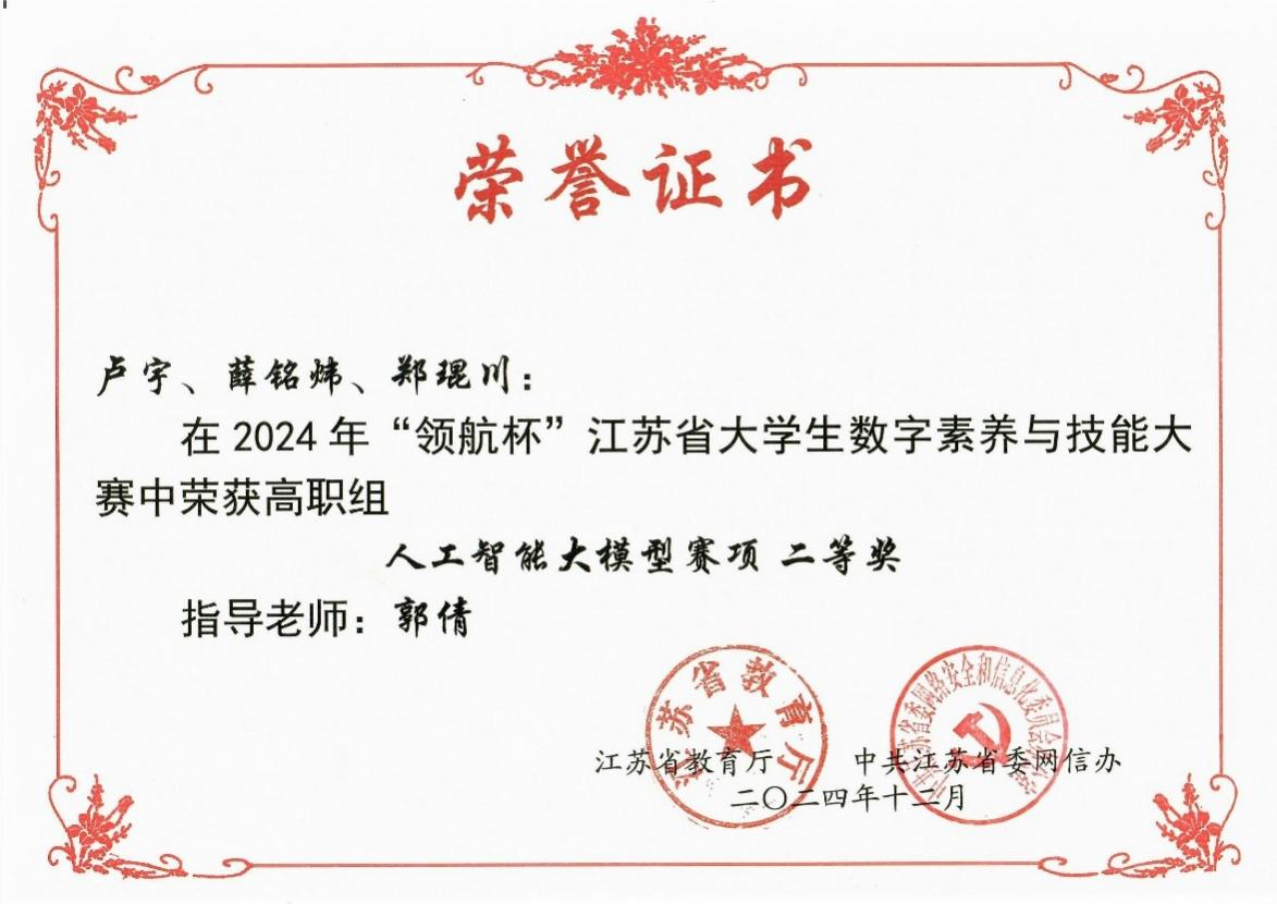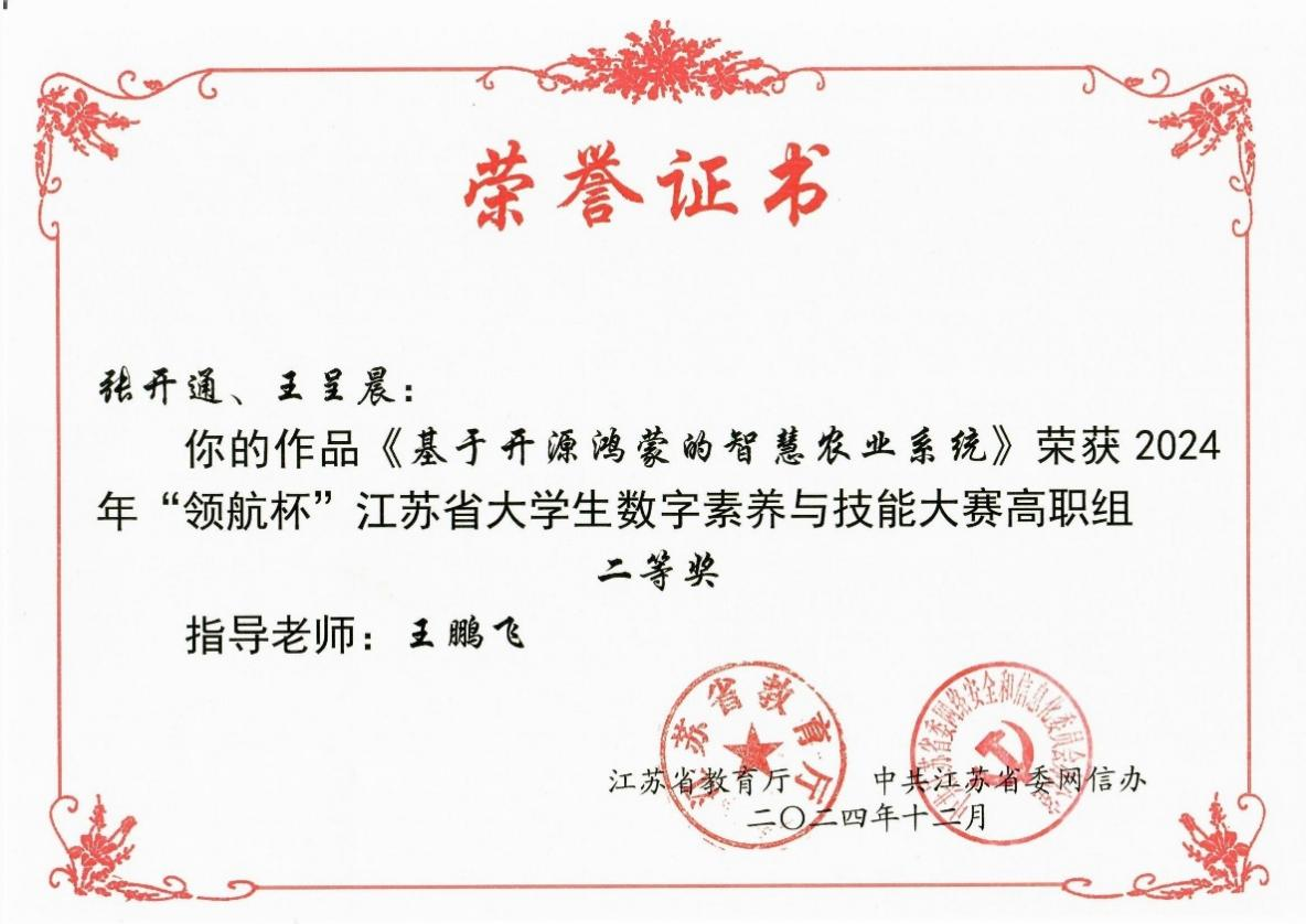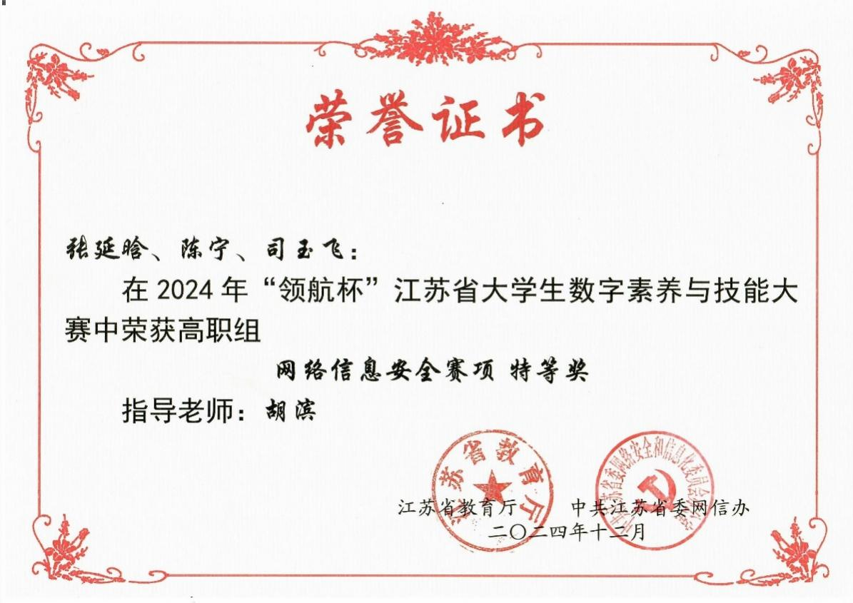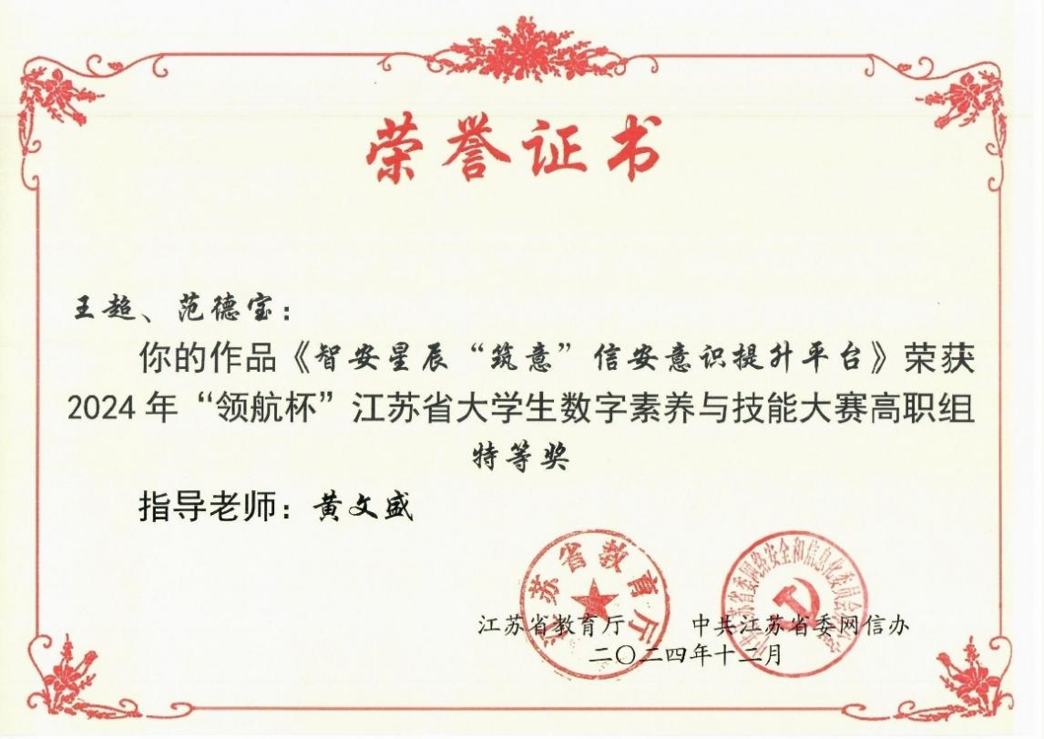 12月27日,2024年“领航杯”江苏省大学生数字素养与技能大赛顺利举办。爱游戏(中国)代表队凭借扎实的专业素养和出色的技能表现,共摘取特等奖3个、二等奖2个。爱游戏(中国)获优秀组织奖,胡滨、黄文盛、王孝磊、郭倩、王鹏飞老师获优秀指导老师奖。