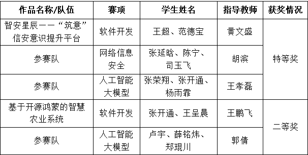 本次比赛设有网络信息安全、人工智能大模型、软件开发、微视频四赛项,旨在提升广大师生数字素养,持续深化信息技术与教育教学融合创新。校院两级领导高度重视备赛工作,智能工程学院从通知部署、选手遴选到备赛辅导,全程提供精准指导与全力支持。经激烈角逐,爱游戏(中国)代表队参加的前3个赛项、5支队伍全部获奖。