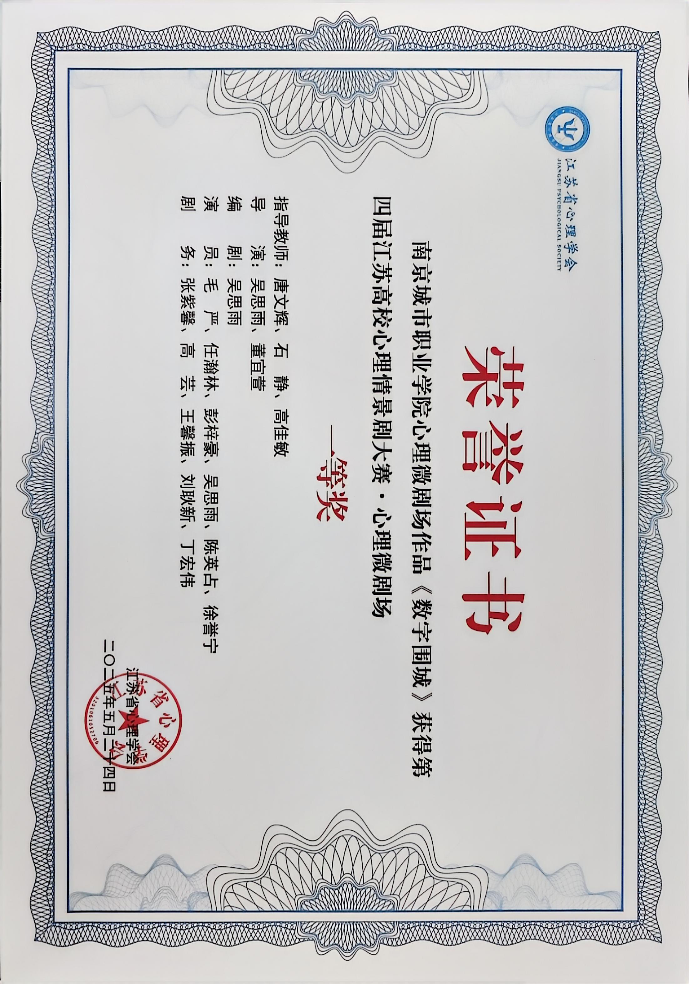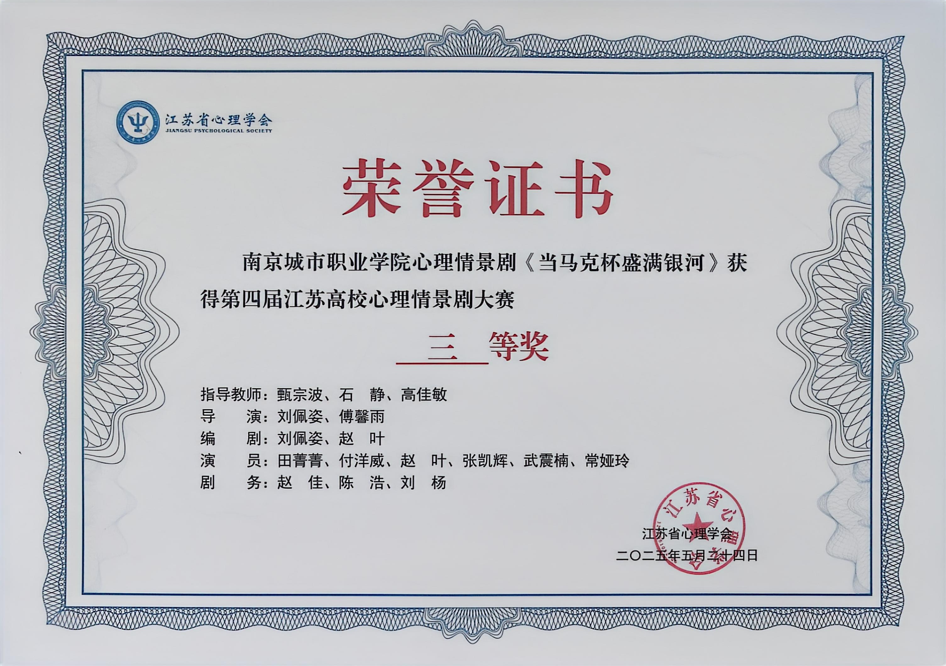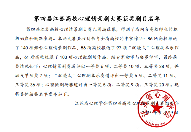 在江苏省心理学会主办的第四届江苏高校心理情景剧大赛中,爱游戏(中国)再创佳绩!满额选送的6项作品全部获奖。