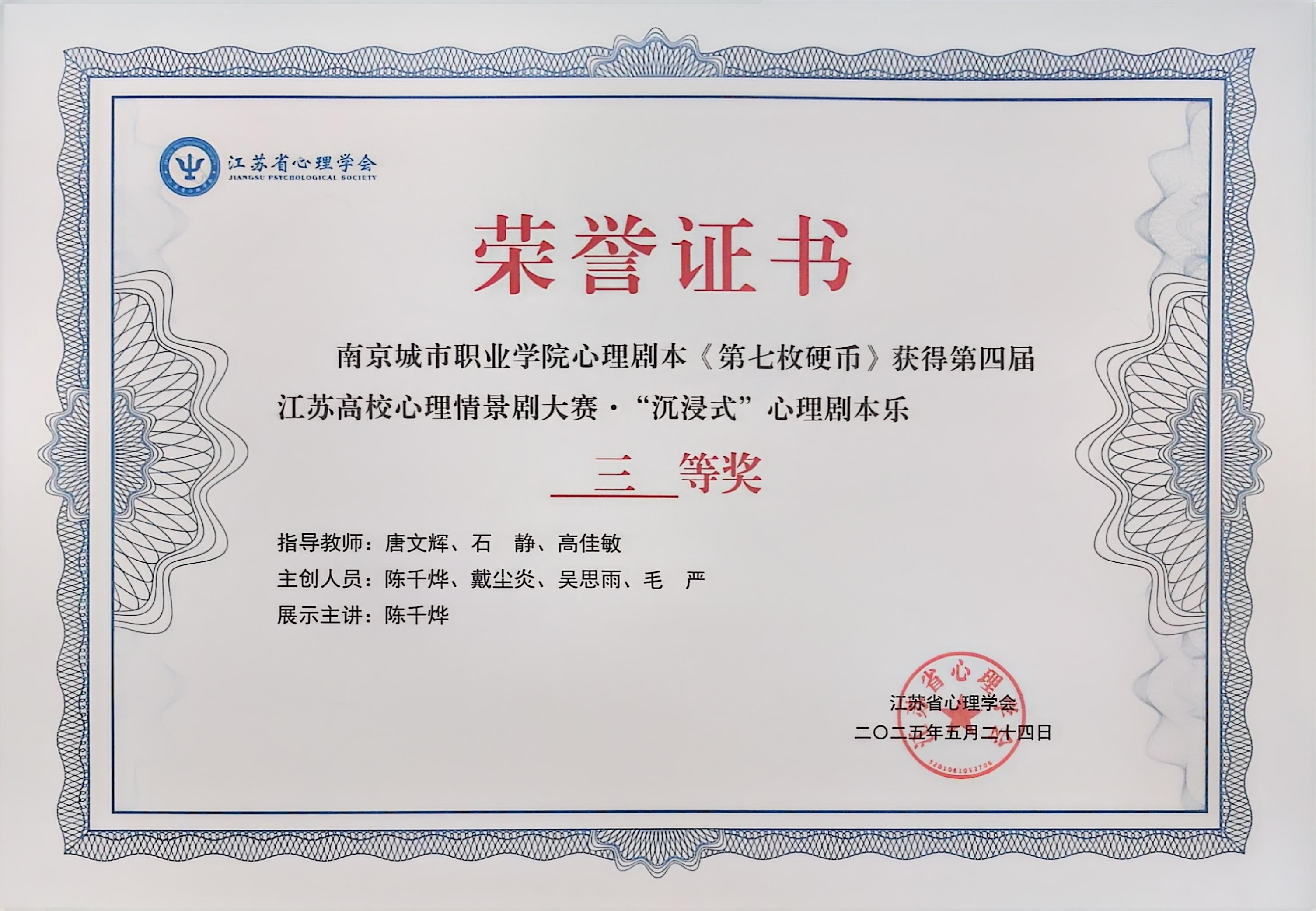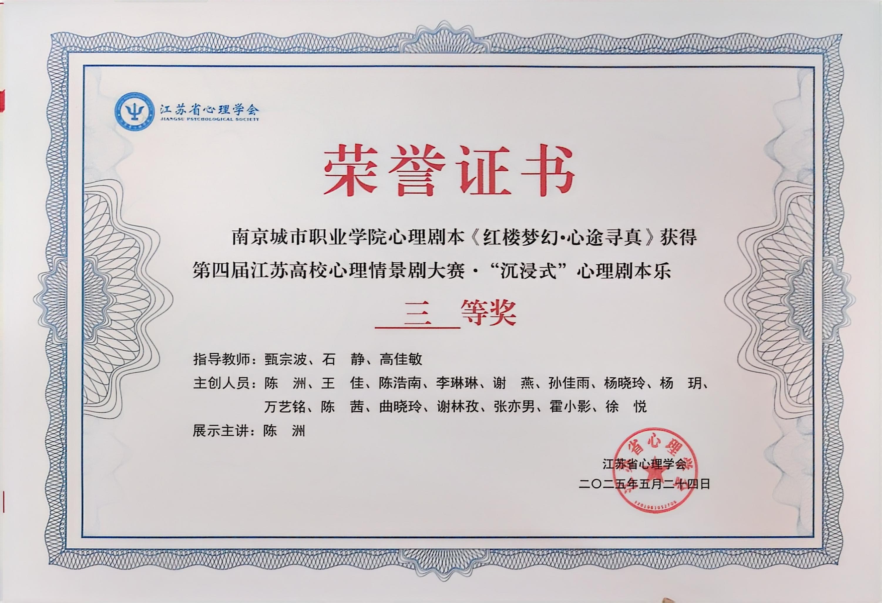 “沉浸式”心理剧本乐赛项中,《红楼梦幻・心途寻真》借《红楼梦》经典故事剖析心灵成长,《第七枚硬币》以神秘硬币为线索揭开电信诈骗心理奥秘,二者均获三等奖。