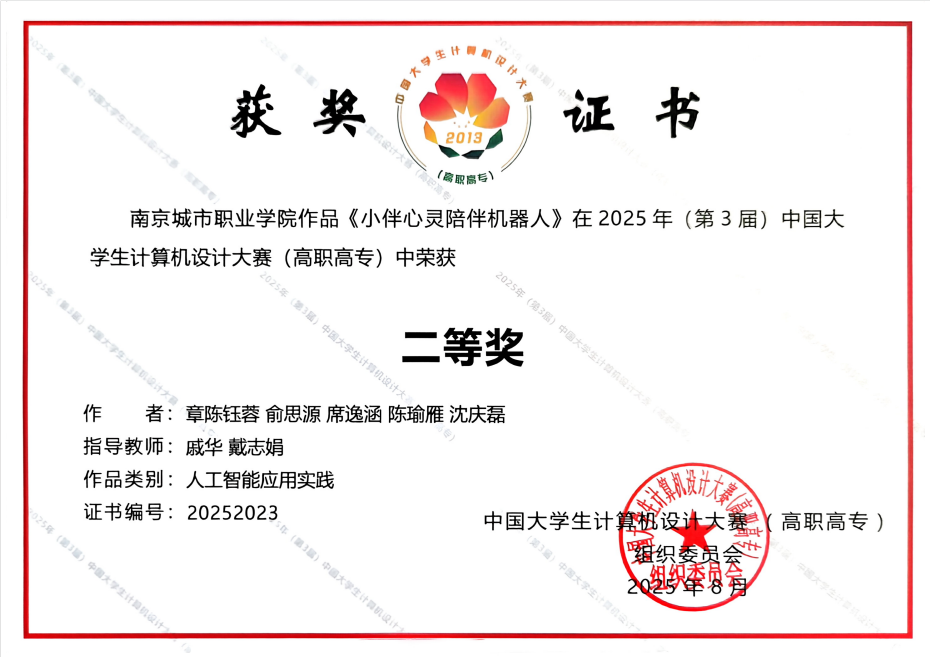 本次大赛吸引了来自全国19个省、173所高职院校的435支优秀团队参加。竞赛项目涵盖软件应用与开发、微课与AI辅助教学、人工智能应用、数媒静态设计、数媒动漫与短片、数媒游戏与交互设计共六大类,对参赛选手的计算机综合素养和实践能力提出了极高要求。智能工程学院由章陈钰蓉、俞思源、席逸涵、陈瑜雁、沈庆磊五位同学组成的参赛队伍在戚华、戴志娟老师的悉心指导下,历经数月艰苦备赛,从项目选题、方案设计到技术实现,每一个环节都精益求精。他们紧密围绕大赛主题,结合自身专业优势,最终打造出具有创新性与实用性的参赛作品《小伴心灵陪伴机器人》,经校赛-省赛-国赛激烈角逐、层层选拔,一路过关斩将,最终获得了国赛二等奖的历史佳绩。