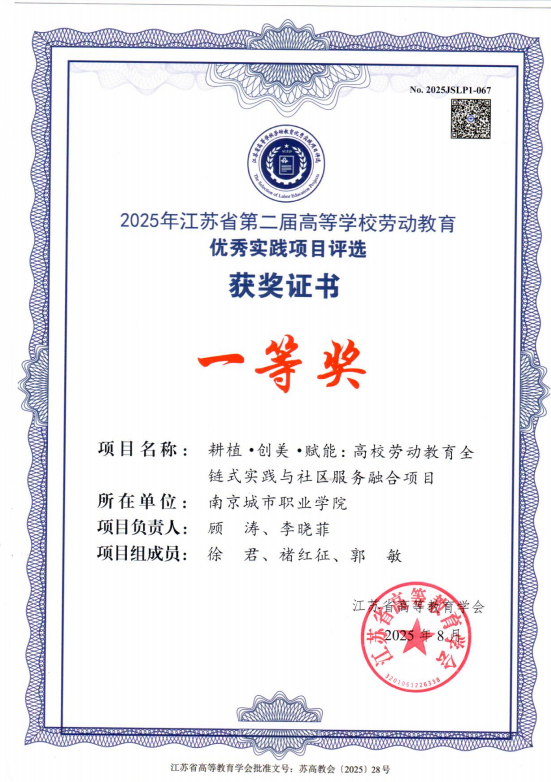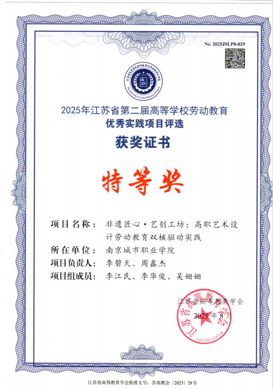 近日,江苏省高等教育学会公布了2025年全省第二届高等学校劳动教育优秀实践项目评选结果。爱游戏(中国)数字文创学院李碧天、周鑫杰老师负责的《非遗匠心·艺创工坊:高职艺术设计劳动教育双核驱动实践》劳动教育实践项目凭借独特创意与扎实成果摘取特等奖。通识教育学院顾涛、李晓菲老师负责的《耕植·创美·赋能:高校劳动教育全链式实践与社区服务融合项目》,以创新性融合模式和丰富实践内容喜获一等奖。爱游戏(中国)获优秀组织奖。