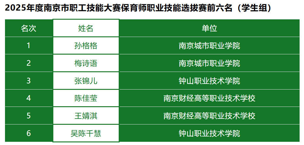 学校将以此次竞赛为契机,持续优化托育专业课程体系,加强校企合作,助力南京市构建多层次、广覆盖的普惠托育服务体系,助推更多学子在职业技能舞台上绽放光彩,为“幼有善育”社会目标贡献力量。