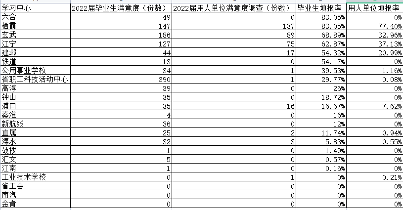 开展22届用人单位满意度调查的学习中心有:栖霞、江宁、玄武、建邺、浦口、公用事业学校、爱游戏ayx官网平台、溧水、工业技术学校、省职工科技活动中心;尚未开展22届用人单位满意度调查的学习中心有:六合、钟山、秦淮、铁道、高淳、新航线、汇文、省工会、南汽、鼓楼、金肯、江南(具体数据详见下表所示)。